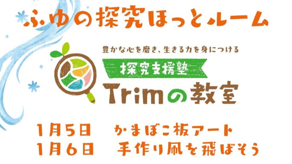 冬休みのあいだ、Trimの教室は「探究ほっとルーム」としてオープンします。 工作をしたり、手を動かして試したり、「なんでだろう?」をきっかけに考えたり。 1月5日:かまぼこ板アート 1月6日:手作り凧を飛ばそう どちらも、「上手につくる」ことが目的... -